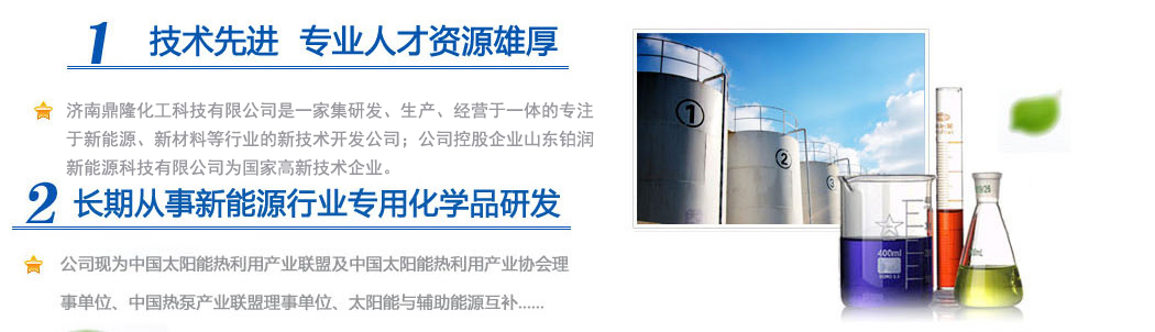 濟南鼎隆化工科技有限公司是一家集研發(fā)、生產(chǎn)、經(jīng)營于一體的專注于新能源、新材料等行業(yè)的新技術(shù)開發(fā)公司;公司控股企業(yè)山東鉑潤新能源科技有限公司為國家高新技術(shù)企業(yè)。擁有雄厚的科研實力和專業(yè)銷售隊伍以及多名從事化學(xué)化工專業(yè)的高素質(zhì)人員,其中博士生導(dǎo)師1人,碩士研究生3人。公司現(xiàn)為中國太陽能熱利用產(chǎn)業(yè)聯(lián)盟及中國太陽能熱利用產(chǎn)業(yè)協(xié)會理事單位、中國熱泵產(chǎn)業(yè)聯(lián)盟理事單位、山東清潔能源供暖產(chǎn)業(yè)聯(lián)盟理事單位、太陽能與輔助能源互補供熱/制冷工程專業(yè)委員會會員單位。公司專注于綠色科技,專業(yè)化研發(fā)環(huán)境友好型化工產(chǎn)品,與眾多高校和國內(nèi)外多家著名化學(xué)品公司保持戰(zhàn)略合作關(guān)系。公司擁有“載能”和“澤能”...更多
